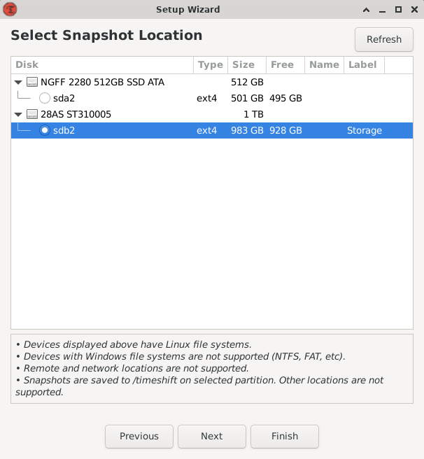 Once it's completed, we'll be asked where we will be storing our backups. We will select the Storage drive that we mounted earlier. Timeshift will create a folder within the root of that drive, in our case: /mnt/storage/Timeshift.